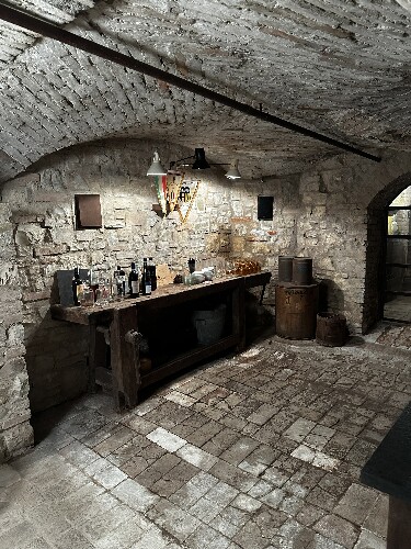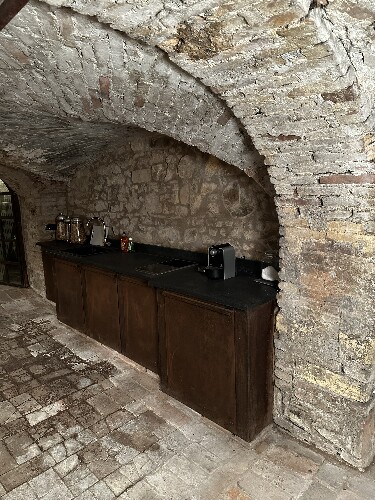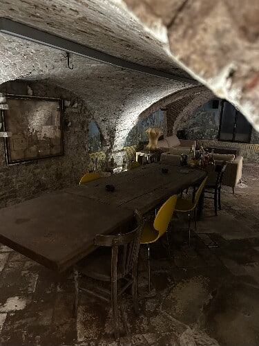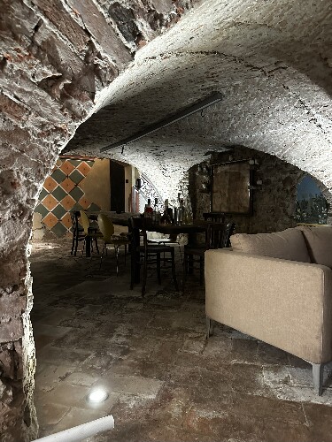 Le volte in pietra originale, gli affreschi d’epoca e il pavimento in cotto autentico donano all’ambiente un fascino senza pari, mentre l’illuminazione moderna crea un perfetto equilibrio tra atmosfera storica e comfort contemporaneo.